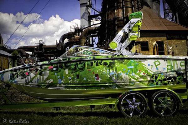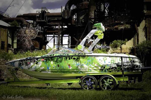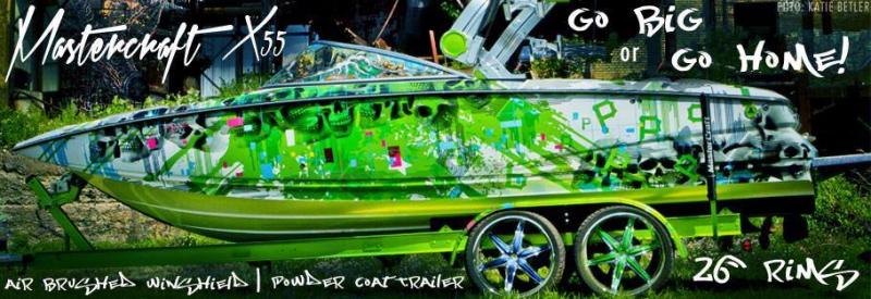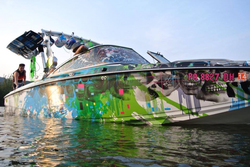 Этот недешевый Mastercraft X-55 как будто пару выходных стоял на пейнтбольном поле. С заклейкой ветровых стекол и дополнительными колонками сверху на тауэре ребята явно перестарались. И черепа уже давно не в теме...