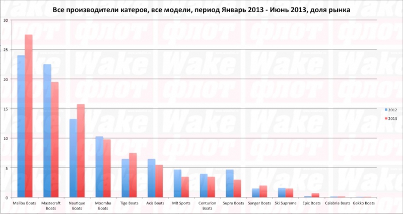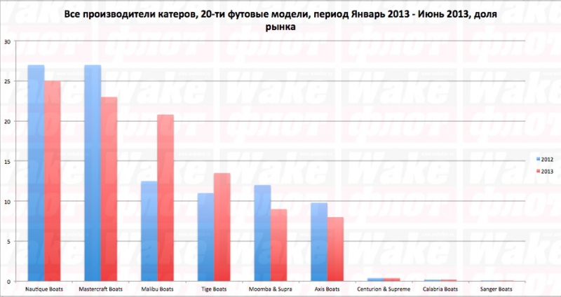 Malibu Boats - компания-фаворит 2013 года, лидер с самой большой общей долей рынка. Во общем росте продаж компании есть огромная заслуга именно 20-ти футовых моделей компании. В 2012 году компания Malibu Boats имела всего одну модель 20-ти футового формата - бюджетный и морально устаревший классический Malibu VTX, поэтому продажи компании значительно снизились. В 2013 году классическому VTX "на помощь" была запущена модель двуносой компоновки - Malibu 20 MXZ. Запуск новой модели позволил компании практически в два раза увеличить продажи малых буксировщиков, претендуя на лидерство в следующем сезоне, тем более, если последует замена классического Malibu VTX.