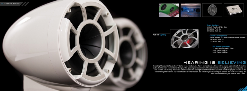Стерео. Обещают ставить полную систему Wet Sounds, хотя на демо-лодке стояли бюджетные колонки.