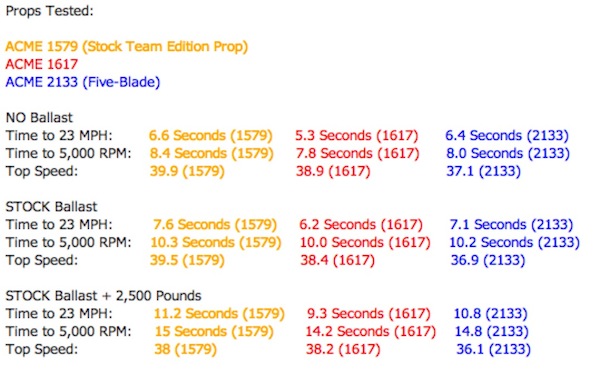 Как влияет смена гребного винта на ходовые характеристики буксировщика, можно увидеть из результатов любительского теста. Катер - Nautique 210 TE. Скорость указана в милях. В любом случае, решение по установке того или другого винта принимать владельцу катера. Но для сохранения гарантии необходимо получить разрешение на установку от производителя.