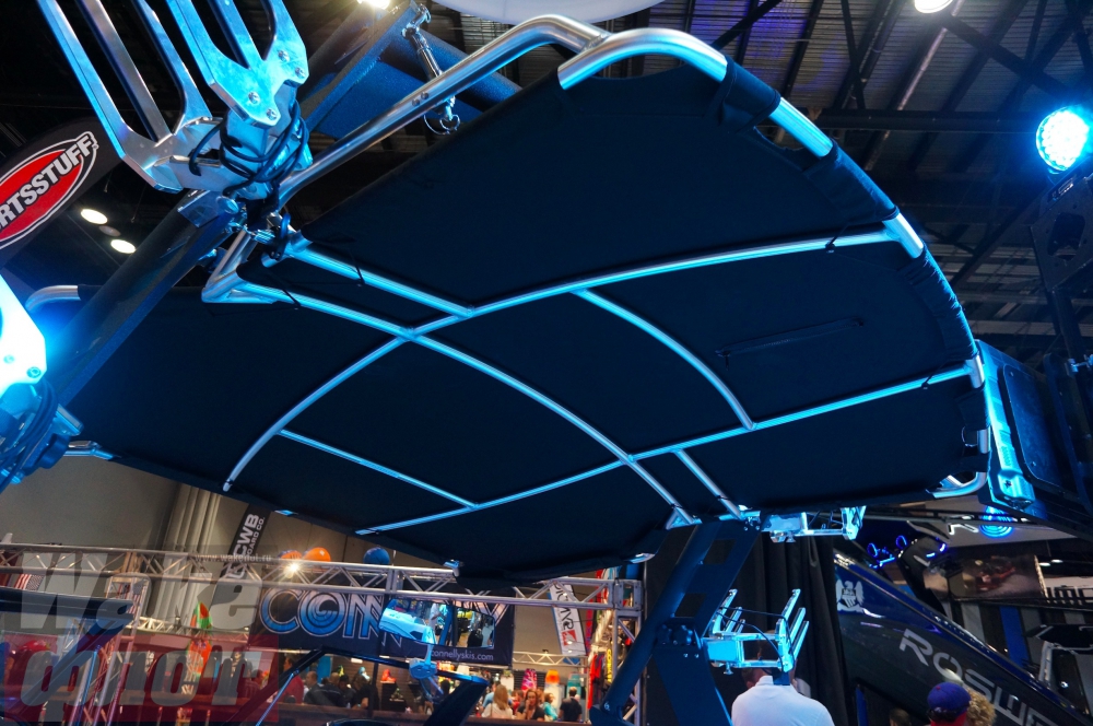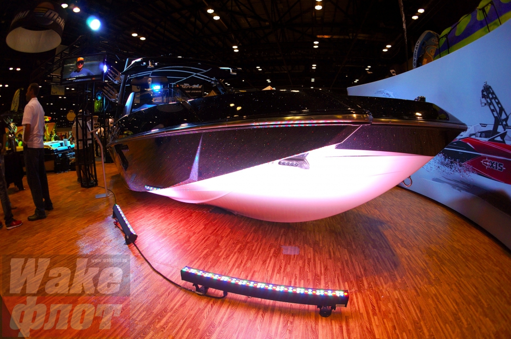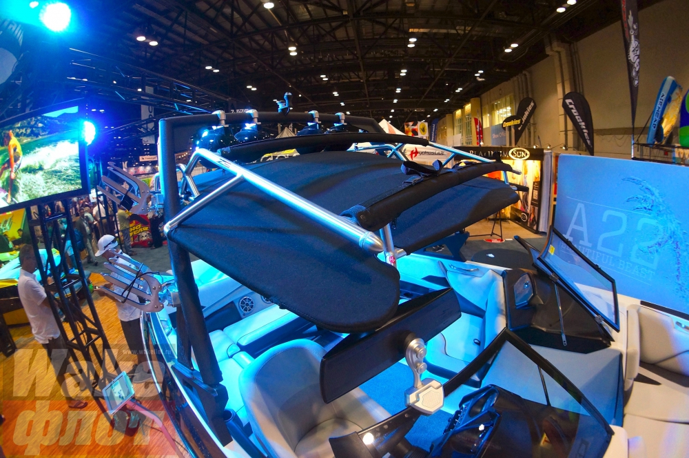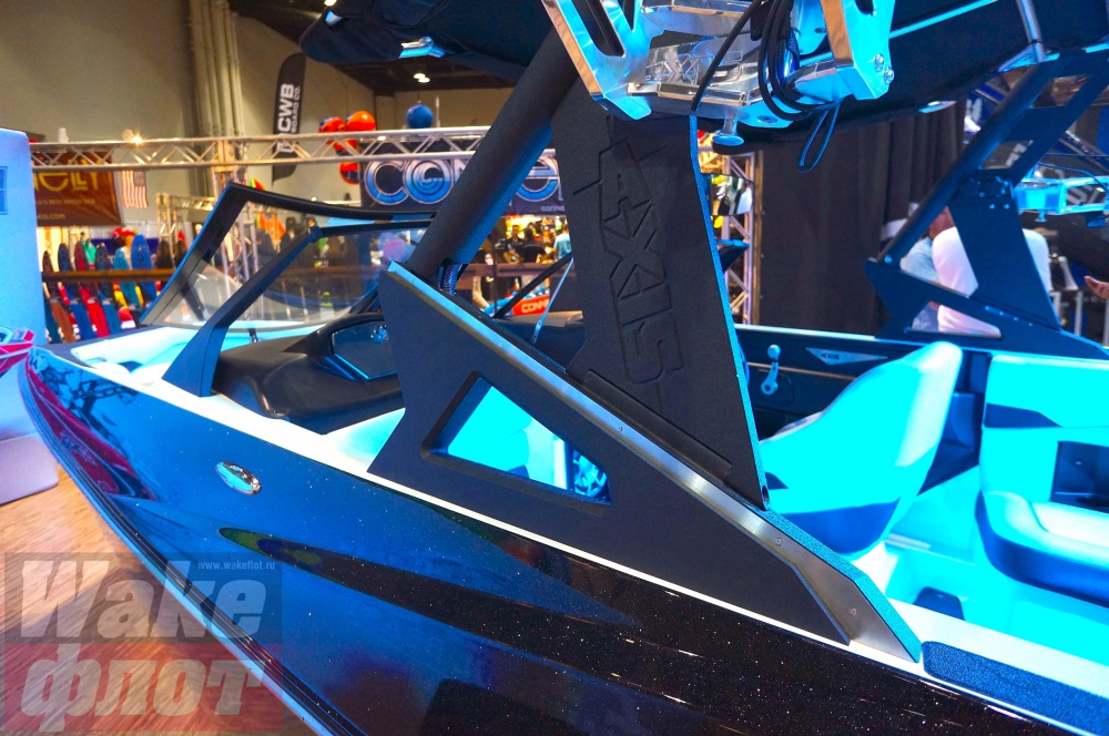 Тент с жестким каркасом и креплениями вейксерфов (как показывает практика, жизнь инновации на рынке буксировщиков в эксклюзивном виде - максимум два года. Через два года вашим изобретением пользуются все. Также и поворотный ходовой тент, разработанный Supra Boats сейчас у всех катеров, включая Axis):