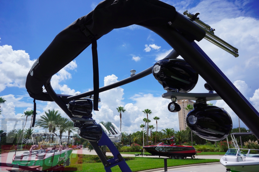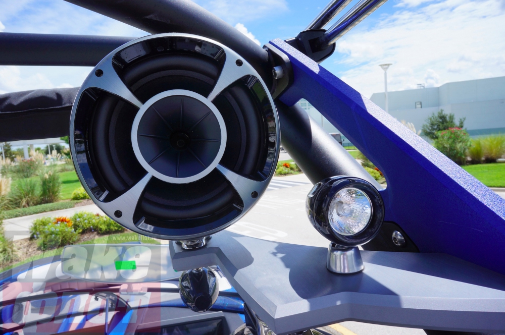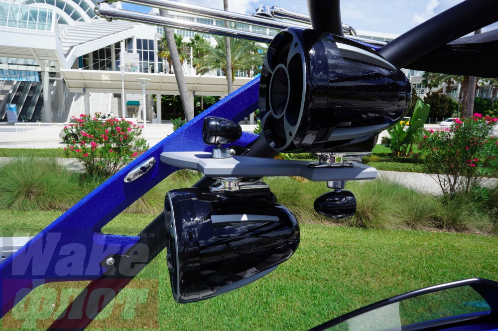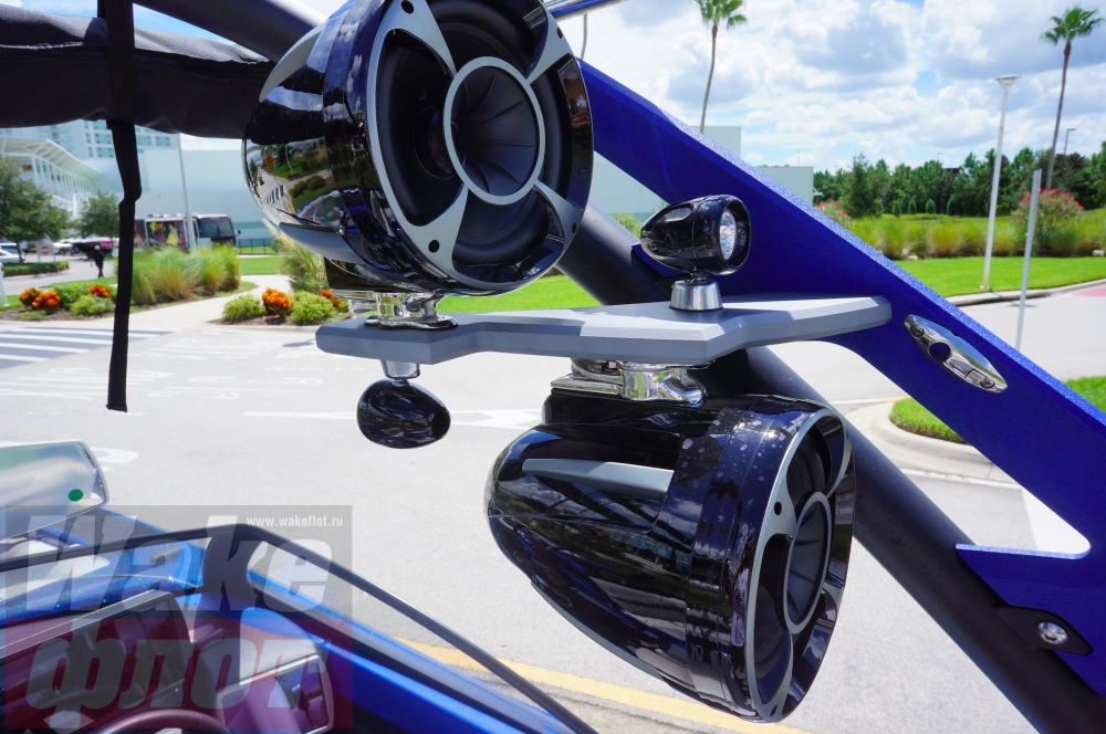 Новые колонки тауэра от Wet Sounds установлены на специальные мощные полки, здесь также вмонтированы парковочные лампы подсветки: