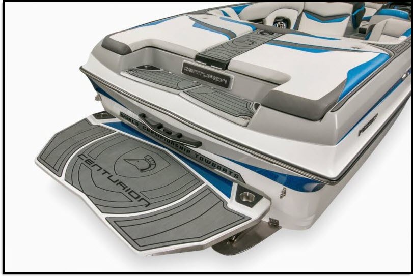 Не знаю, кому нравилась неизменная кормовая часть корпуса Centurion Boats, новая лодка получила полностью новый дизайн кормовой части. Здесь и удобная ступенька, так как корпус стал значительно выше, и новая степ-платформа с подстаканниками (!) (чем еще удивить искушенную публику?)), и удобные крышки моторного отсека: