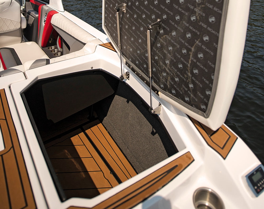 Скажете - это неважно. Но снаряжение для 16-ти пассажиров нужно куда-то девать! Флагман Tige Boats предлагает продуманную систему хранения, с огромными и удобными отсеками для инвентаря и отдельным боксом на корме для вейксерфов.