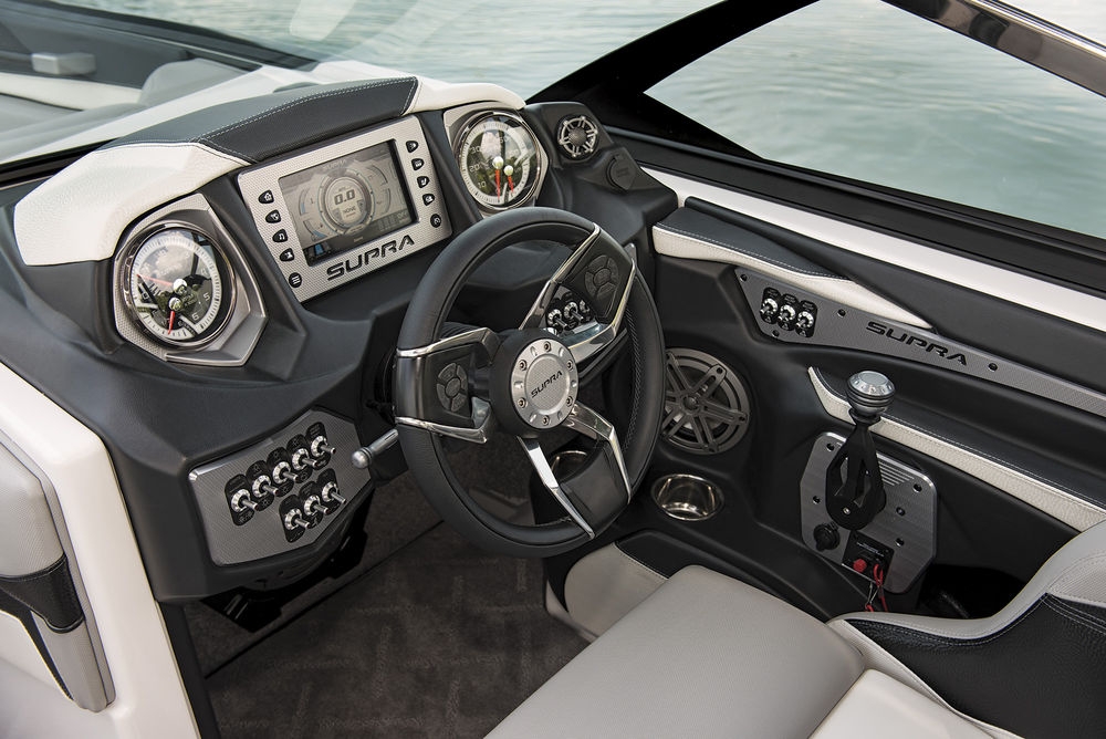 Новый уровень контроля катера с помощью гибридной системы управления Supra Boats. Вам не придется отрывать свое внимание от акватории, чтобы управлять системами катера. Все основные функции управления выведены на рулевое колесо буксировщиков марки Supra - от переключения волны до круиз-контроля.