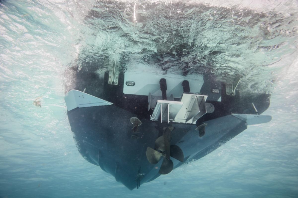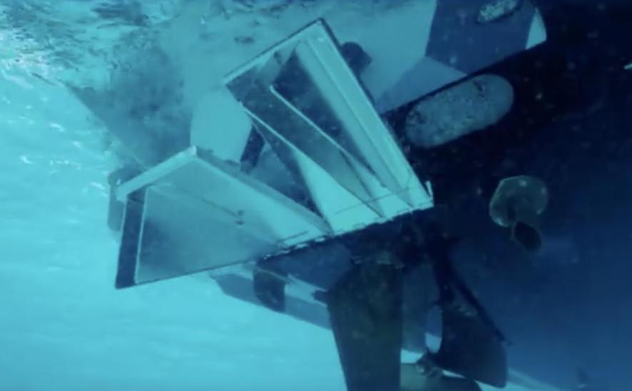 Если хорошо приглядеться, то можно рассмотреть достаточно интересную систему переключения волны, которая состоит их 4-х независимых транцевых плит, которые работают попарно.