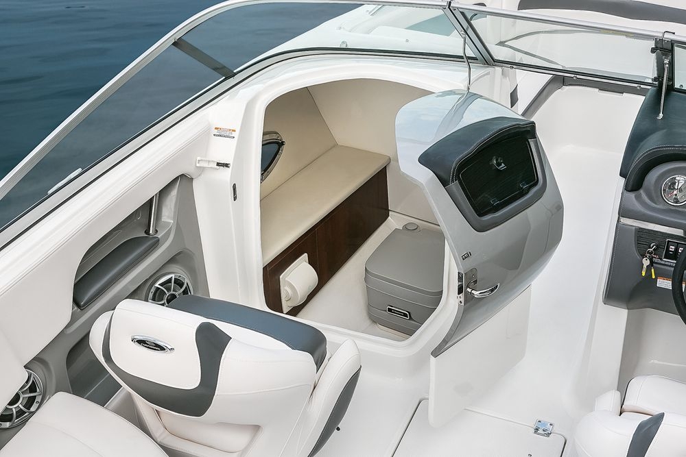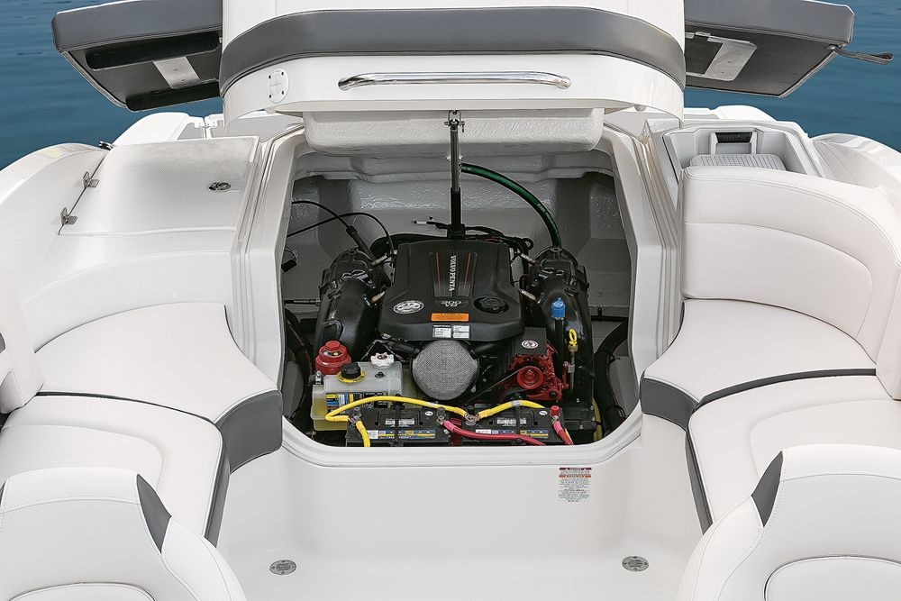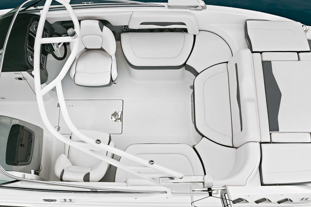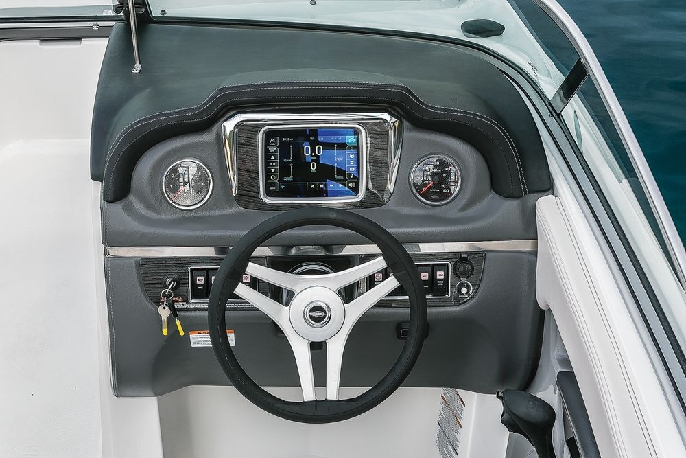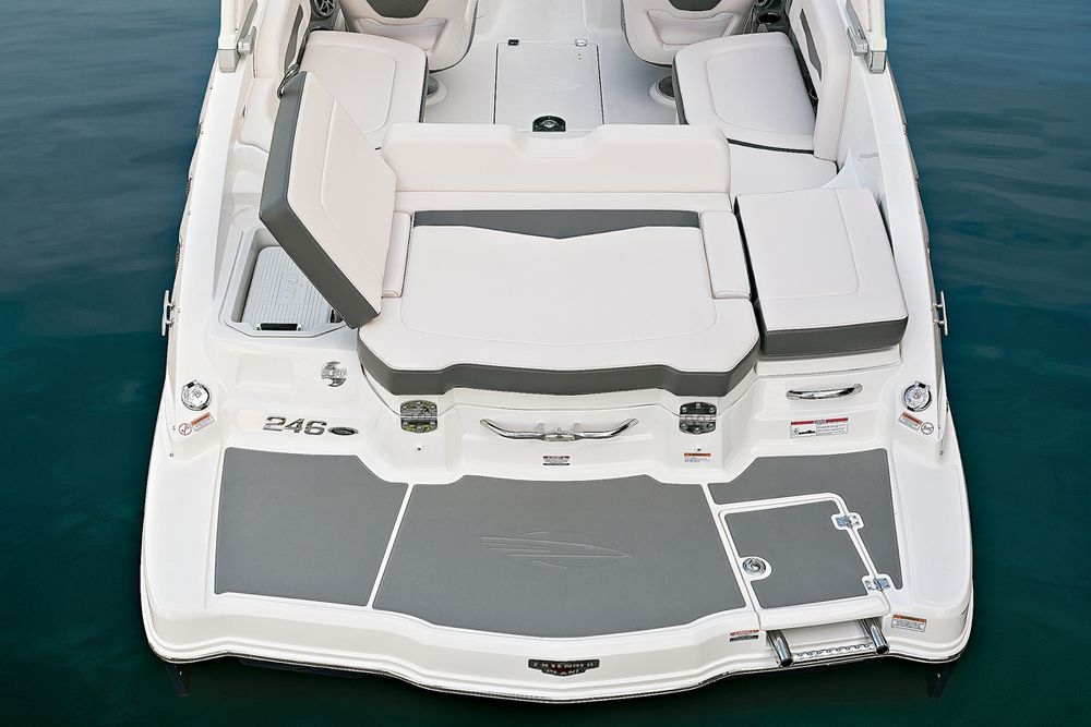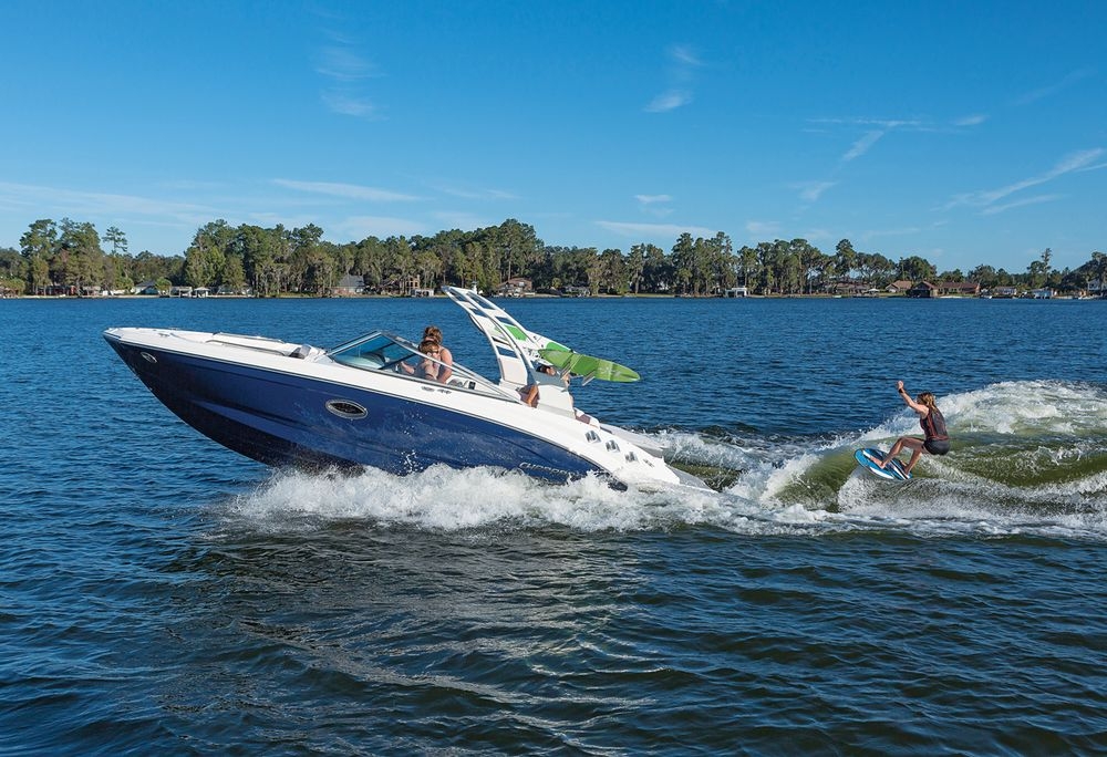 Этот 24-футовый круизный катер получил дополнительные спортивные функции благодаря обратной рулевой колонке Volvo Penta, где гребные винты спрятаны глубоко от райдера.