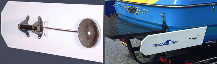 4. Шейпер World of Wake исполнен в другом стиле и имеет только одну присоску. Этот шейпер частично крепится на транцевую плиту и изготовлен из полимеров и нержавеющей стали. Шейпер белого цвета и заметен в воде, во время испытаний не отрывался. Его пластина расположена вдоль корпуса, поэтому он менее агрессивно цепляется за воду. Цена в США 425 USD.