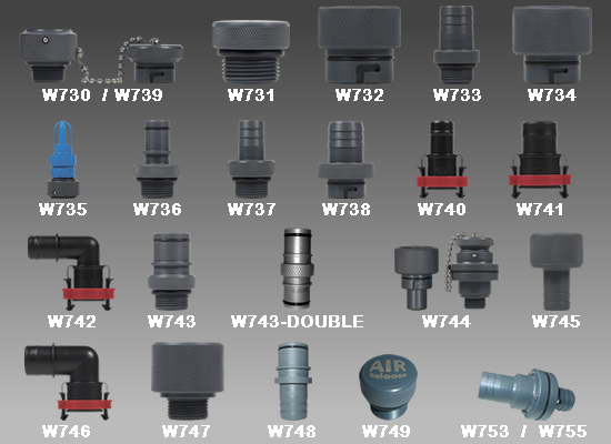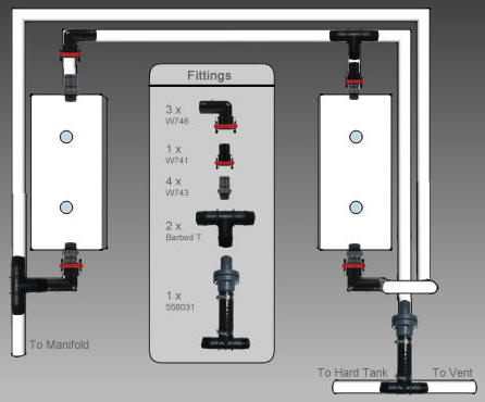 Встроенные балластные системы имеют два вида коннекторов и шлангов - 3/4 (внизу) и 1 1/8 дюйма (вверху).