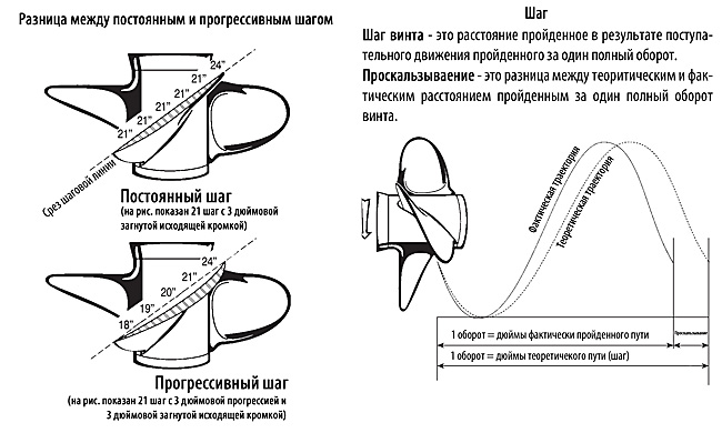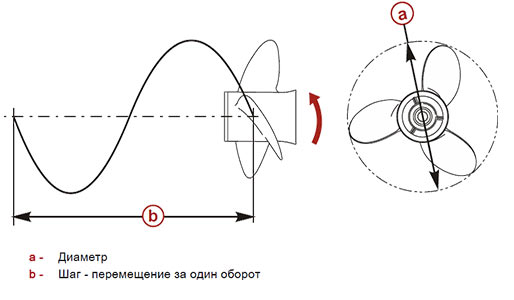 Шаг гребного винта - шагом винта называется путь в направлении оси, который проходит любая точка поверхности винта за один его оборот. Это очень важный параметр, на который обращают внимание в первую очередь. А также это главная характеристика, влияющая на нагрузку мотора. Чем больше шаг, тем больше скорость, при этом мотор должен развивать максимально разрешенные паспортные обороты. Обязательно используйте тахометр при выборе шага винта.