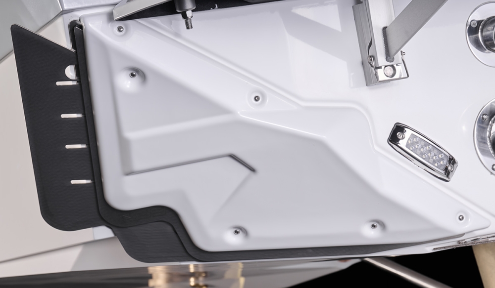 На корме предусмотрена установка дополнительной складной лестницы. А также хочется отметить, что при таком компактном корпусе на корме небольшие кормовые сиденья. Также очень правильно наклеивают нескольящее покрытие на корпус над транцевой плитой. Это защищает корпус от повреждений досками.