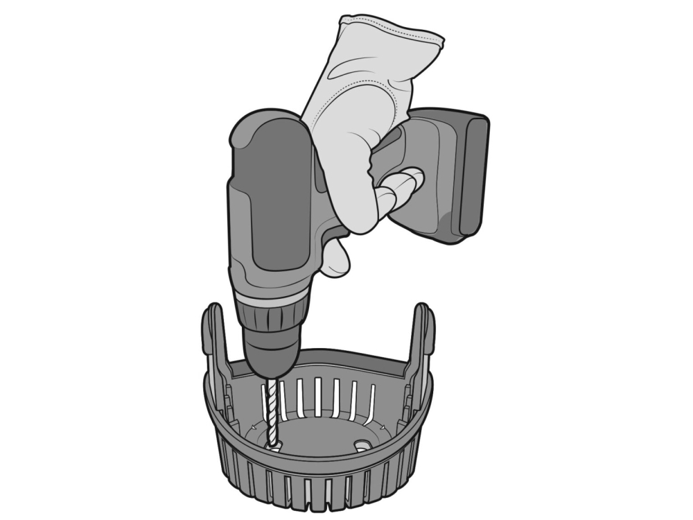 Снимите решетку основания с насоса, нажав на два фиксатора. Затем используйте основание в качестве шаблона, чтобы отметить два отверстия, убедившись, что насос будет ориентирован таким образом, чтобы напорный шланг можно было легко подсоединить к выходному отверстию.