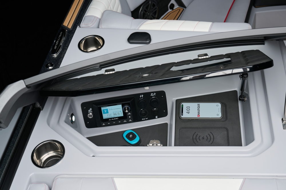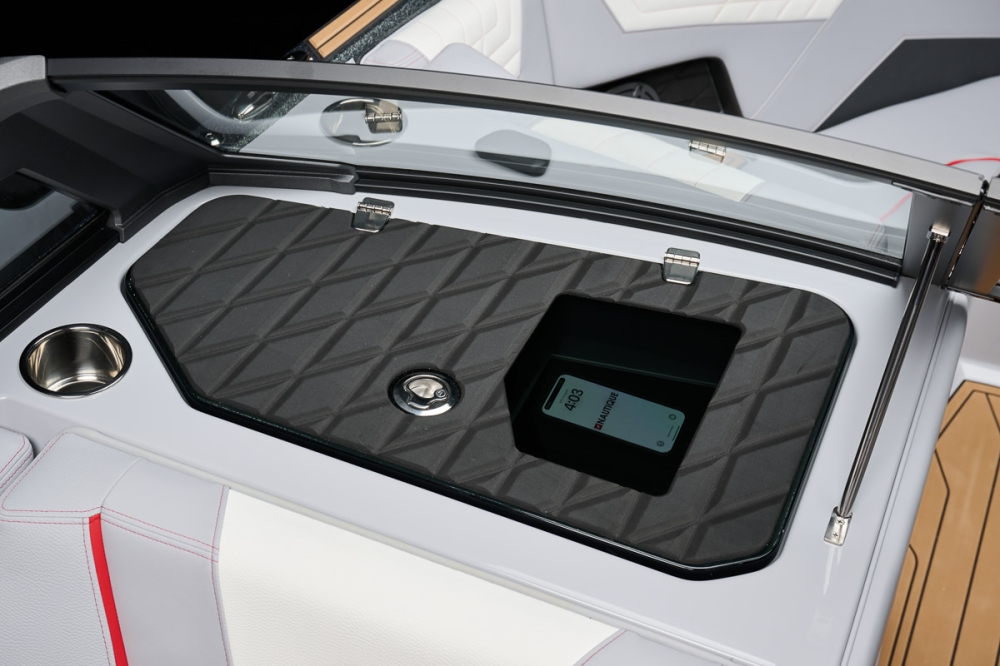 В бардачке с пассажирской стороны установлены беспроводные зарядки. Такое защищенное расположение электрически нагруженных компонентов - лучшее решение, чем у Axis Boats.