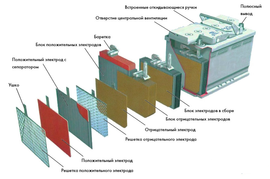 Обычный традиционный аккумулятор, называется свинцово-кислотным аккумулятором. Это пластиковый корпус, внутри которого находится множество пластин, объединенных в группы ячеек. Эти пластины обычно изготавливаются из свинца с металлическими добавками для повышения прочности и потока электронов, а также покрыты пастой из оксида свинца. Раствор, окружающий пластины, называется электролитом, обычно состоящим из 35% серной кислоты и 65% дистиллированной воды. Происходящая химическая реакция приводит к образованию электронов, высвобождая часть энергии, запасенной в аккумуляторе. Аккумулятор хранит только ту энергию, которая в него была заложена.