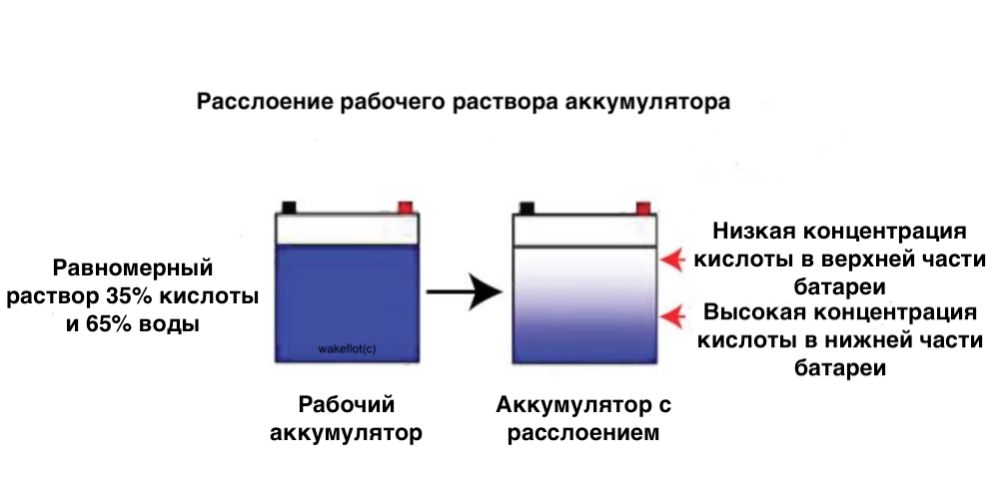 Процесс зарядки и разрядки батареи приводит к изменению консистенции электролита. При зарядке батареи образуется кислота, которая плотнее или тяжелее электролита. При разрядке батареи образуется вода, которая легче электролита. В результате вода плавает на поверхности более тяжелой кислоты. Это называется «кислотным расслоением». Когда батарея заряжается почти до полного заряда, возникающее более высокое напряжение приводит к образованию пузырьков водорода и кислорода, которые постепенно поднимаются через электролит и выходят через вентиляционные отверстия в верхней части каждой ячейки.