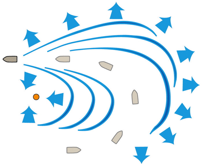 На 270 градусов от точки разворота вы производите большие волны, которые отправляются до берегов водоема. Каждый раз, исполняя скоростной разворот вы производите дополнительные волны, "разбивая" акваторию на огромной площади. Волны накладываются друг на друга и возникают дополнительные неудобства для большого количества участников движения на воде, включая вас.