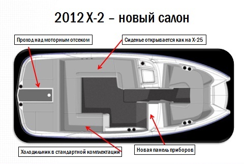 Конфигурацию салона Mastercraft X-2 изменили, катер получил специальный проход над моторным отсеком, а также холодильник под пассажирским сиденьем в стандартной комплектации: