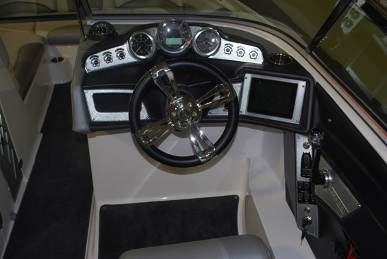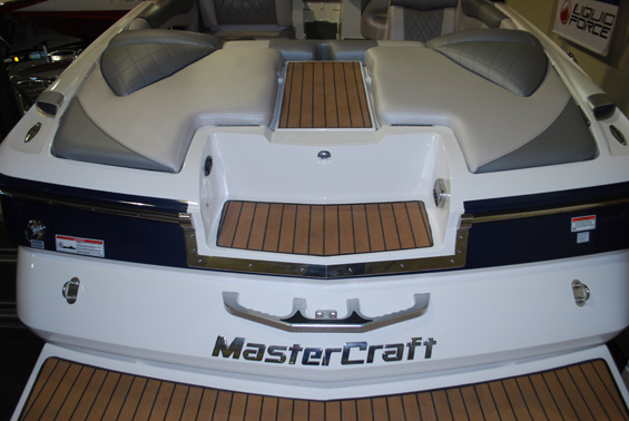 Основные изменения в салоне коснулись рабочего места водителя. Новый руль и панель управления более спокойного дизайна. Сенсорная панель управления Mastecraft BIG "переехала" в правую часть панели приборов ближе к ручке управления газом, как на Tige Boats. Проход над моторным отсеком отделан нескользящим покрытием "под тик", как на Nautique Boats.