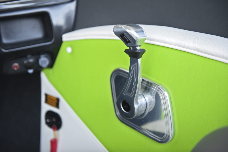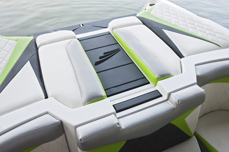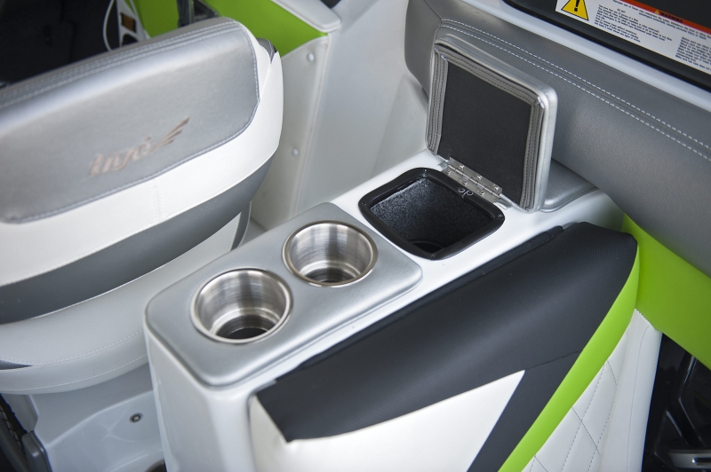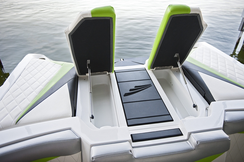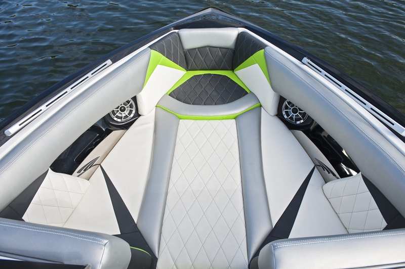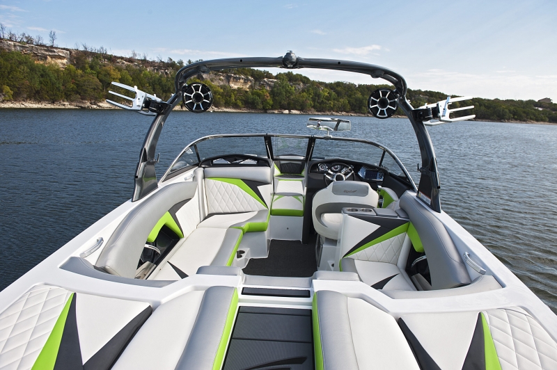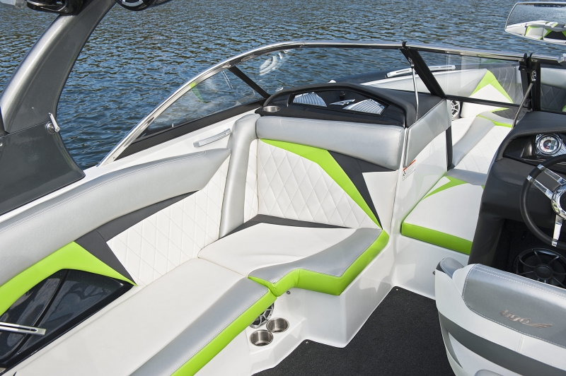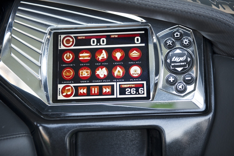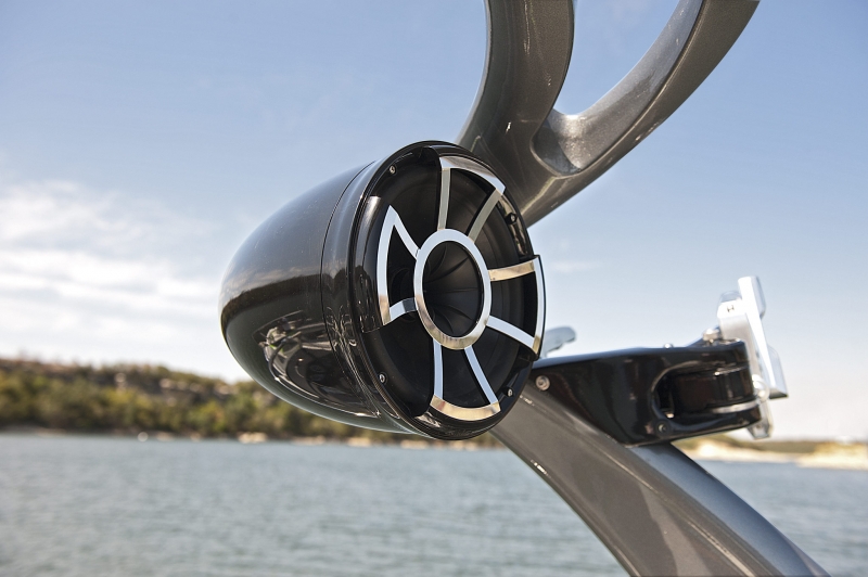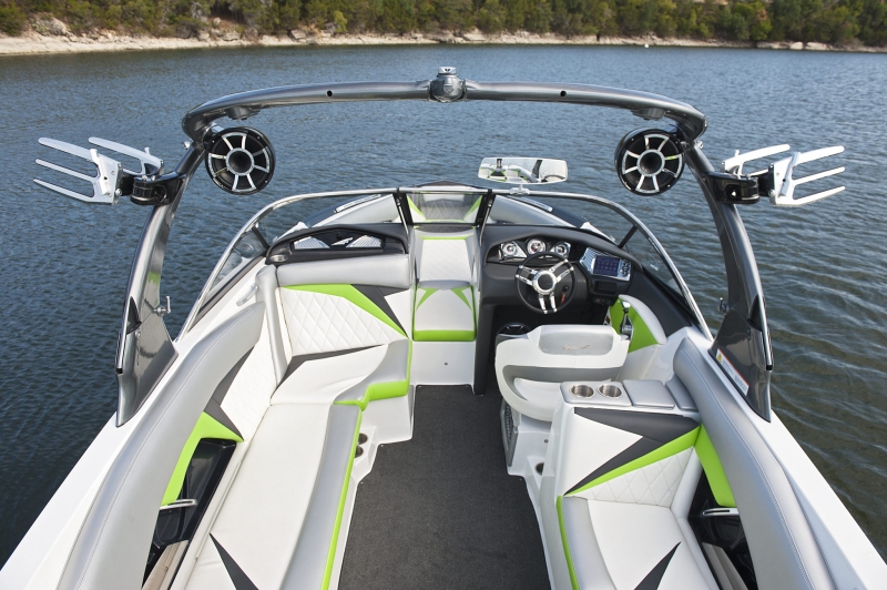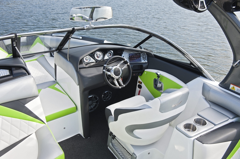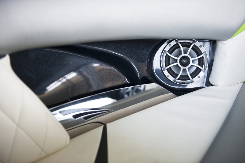 Футуристическое панорамное зеркало заднего вида из полированного алюминия органично вписывается в интерьер катера. Единственное в своем роде зеркало обеспечивает водителю практически180-градусный обзор акватории. Он получает возможность видеть все трюки от начала до конца.