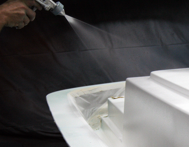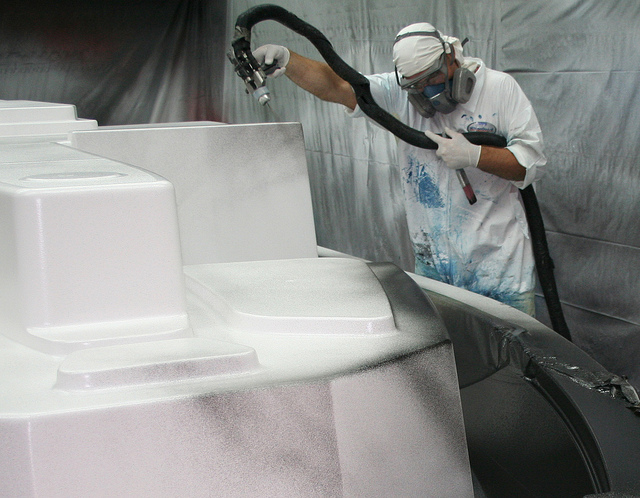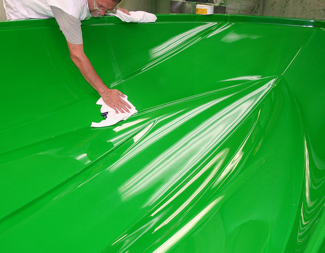 После окончания подготовительных работ, начинается основной процесс изготовления корпуса катера, и начинается он с нанесения гелькоута (внешнего покрытия корпуса), т.е. корпус строят снаружи-внутрь, также перед нанесением гелькоута может быть нанесен специальный защитный слой:
