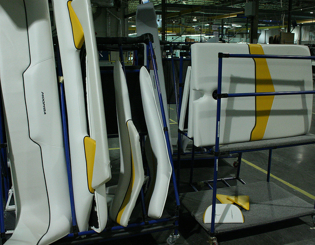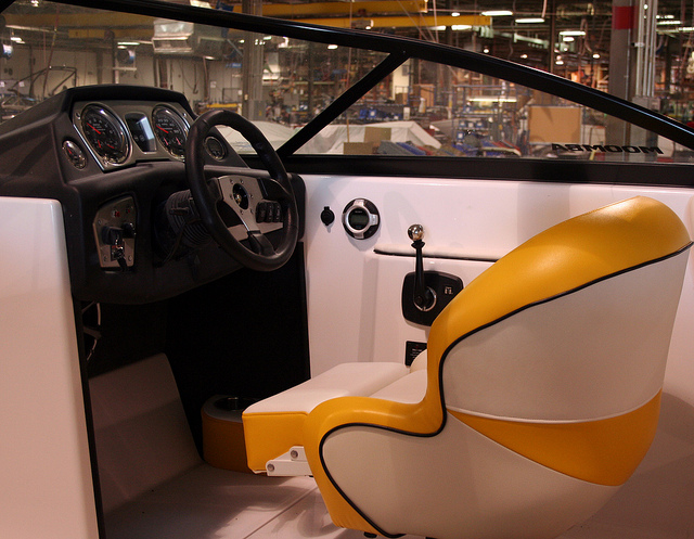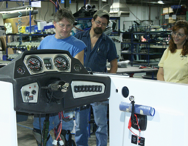 Параллельно рабочие собирают панель приборов и детали салона катера: