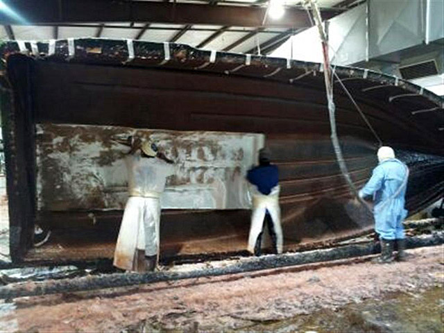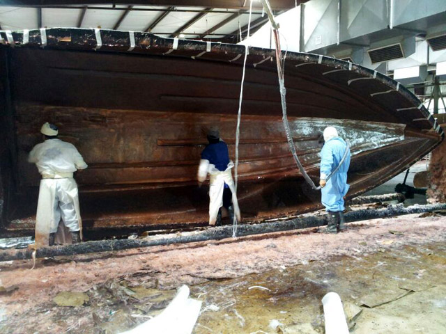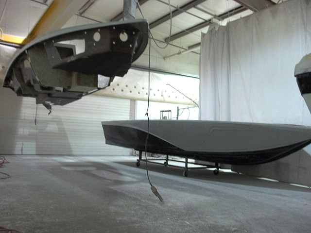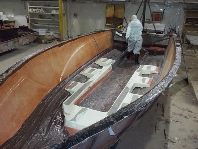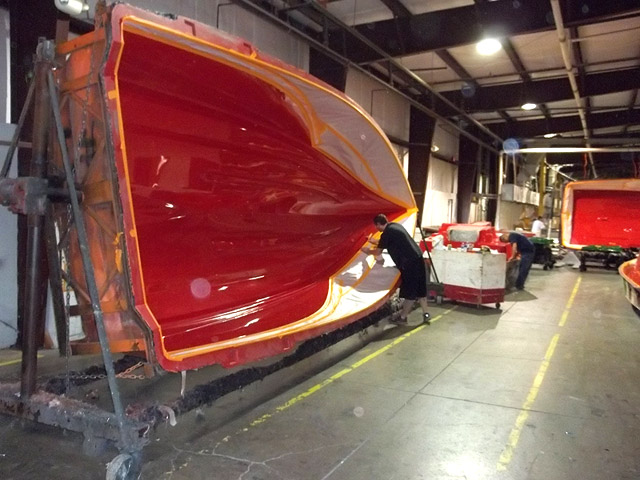Если попытаться вытащить гелькоут из формы на этом этапе, ничего, кроме кучи обломков вы не получите. Далее наносится основа корпуса - многослойная стеклоткань различной фактуры. Связующим элементом всех слоев раскроя корпуса является специальная полиэфирная смола. Рабочие следят за тем, чтобы смола тщательно пропитывала стеклоткань и под ней не оставалось воздушных пузырей.