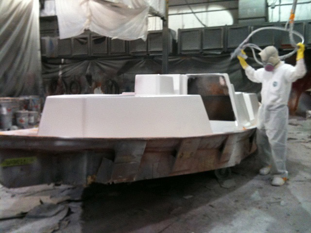 Гелькоут напыляется на форму многими слоями, на фото нанесение гелькоута на палубу Tige Z3: