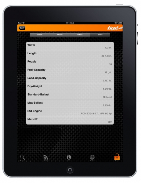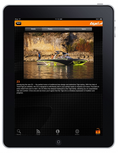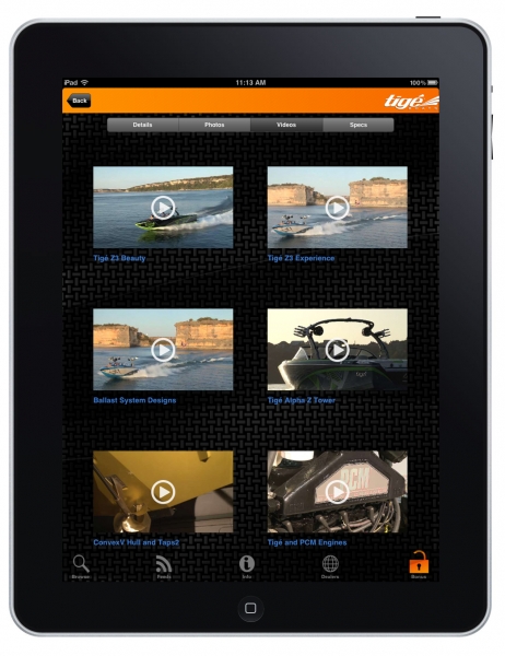 Сесть за руль каждого из катеров Tige 2012 модельного года можно в новом приложении для Apple. Вы можете исследовать каждую модель с подробными спецификациями, обширными фотогалереями и качественным видео. Для вас видео-тесты лодок, новостная лента и все социальные сети в одном приложении.