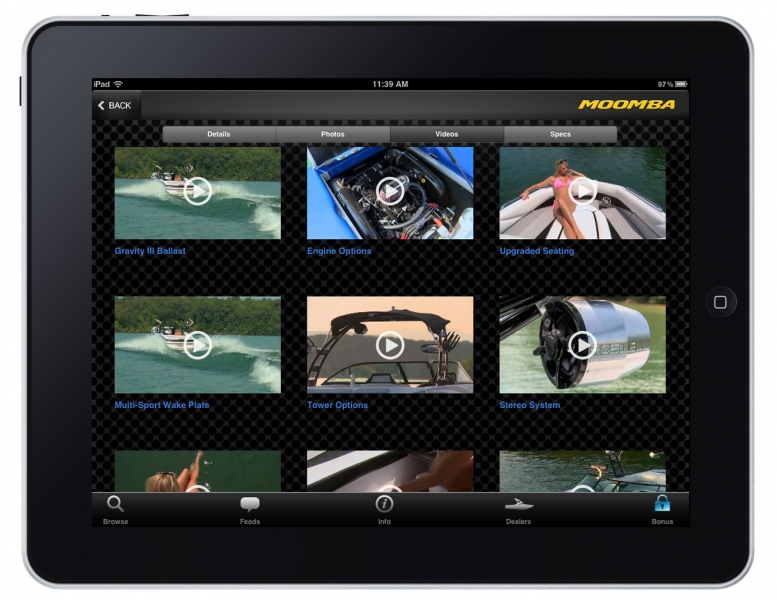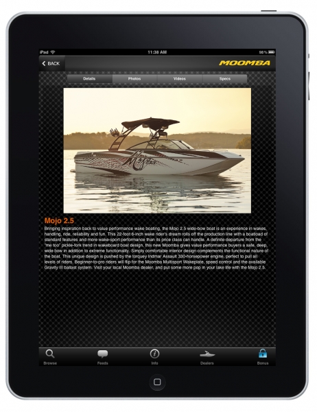 Moomba Boats представляет обновленное приложение для Apple-гаджетов. Интерактивный модельный ряд пополнился новой Moomba Mojo 2.5. Обновили видео и фото-галереи. Также здесь есть удобный дилер-навигатор.