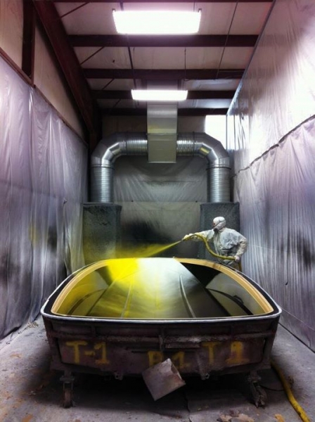Первый этап производства корпуса Malibu Boats – нанесение гелькоута (внешнего слоя корпуса) на форму модели.