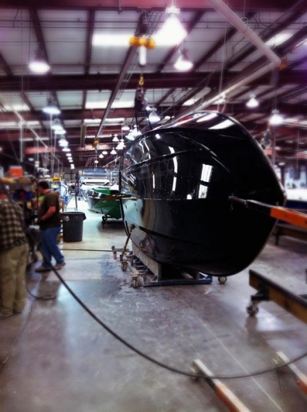 Основной сборочный цех, катера перемещаются по конвейеру на специальных тележках.