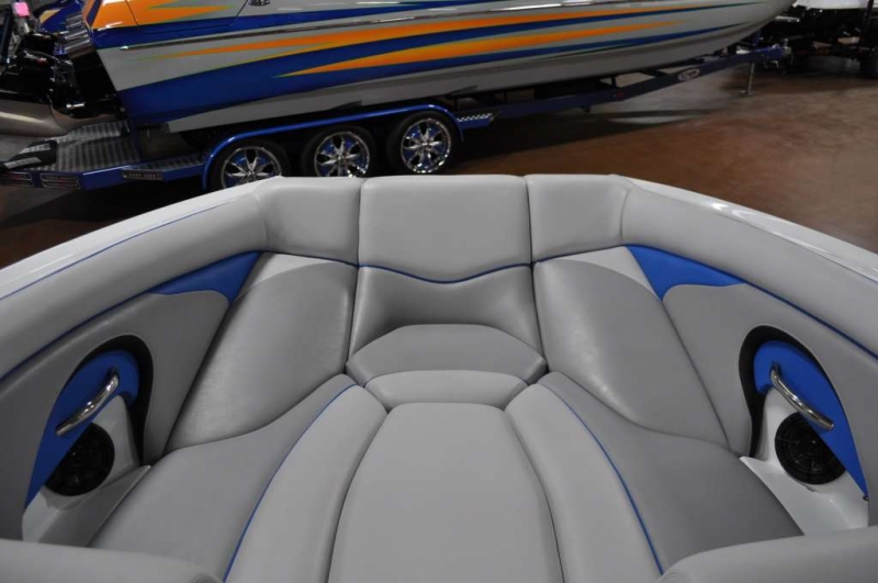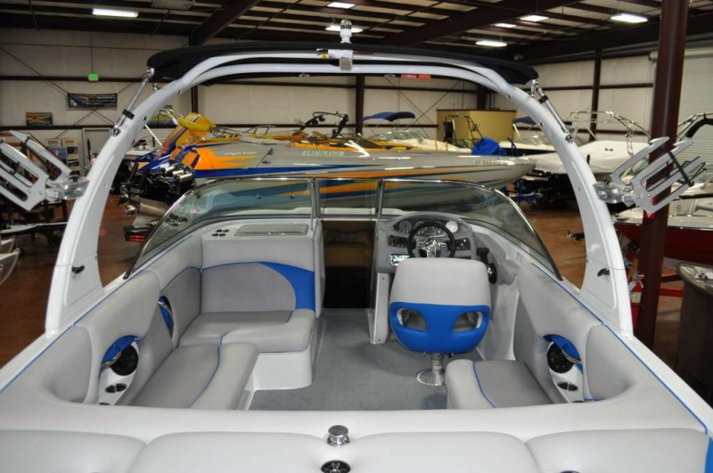 Для ценителей комфорта – вместительный 15-ти местный салон, почти как у 24-футового катера. В стандартной комплектации 500-килограммовая балластная система, тауэр с держателями вейкбордов и стерео-система.