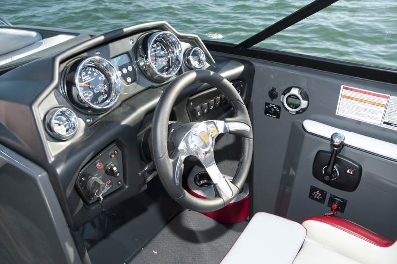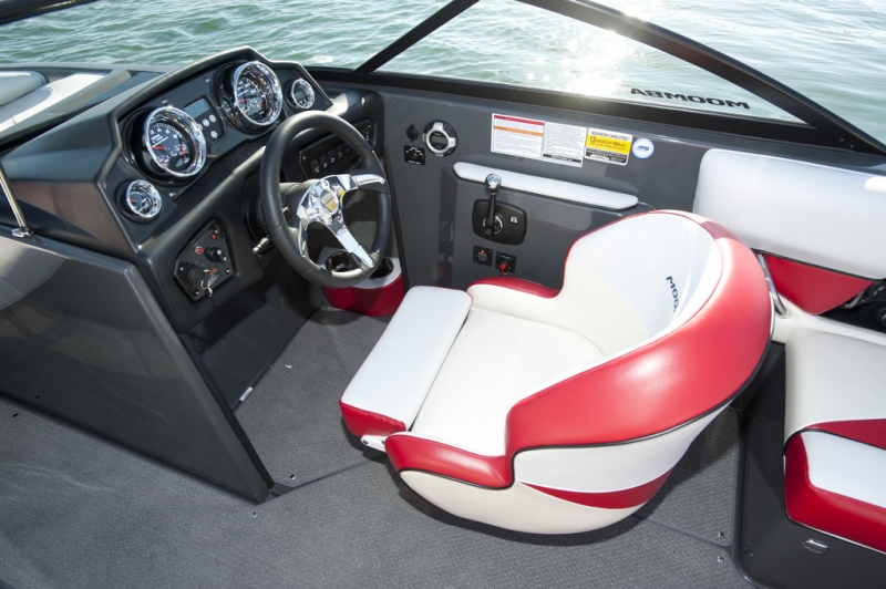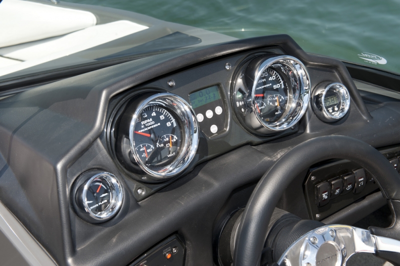 Рабочее место водителя. Панель приборов стала более информативной. Вместо архаичной и невыразительной панели теперь большие аналоговые спидометр и тахометр. Они занимают большую часть панели. Спасибо инженерам Moomba Boats, новая панель отлично выглядит.