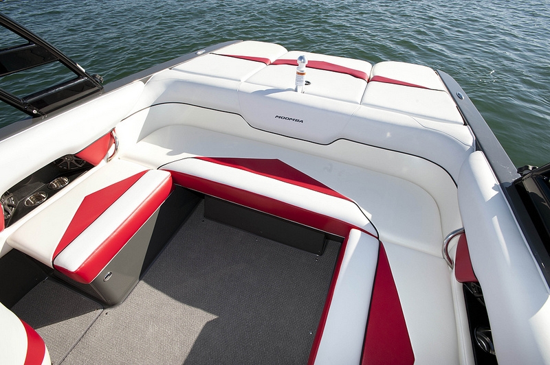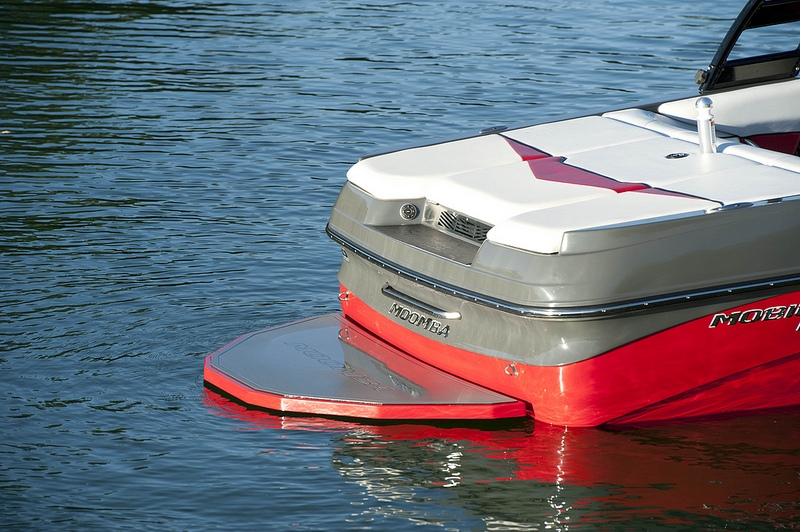 Для удобства райдеров инженеры Moomba Boats предусмотрели небольшую специальную ступеньку над транцевой плитой. Нельзя сказать, что она в таком виде будет полезна, но мыслят они точно в правильном направлении. Также хочется сказать отдельное спасибо за то, что изменили форму транцевой плиты. Вместо ужасной плиты полуофальной формы, которая якобы не мешает формированию чистой волны, с нового года устанавливают транец, не уродующий лодку.