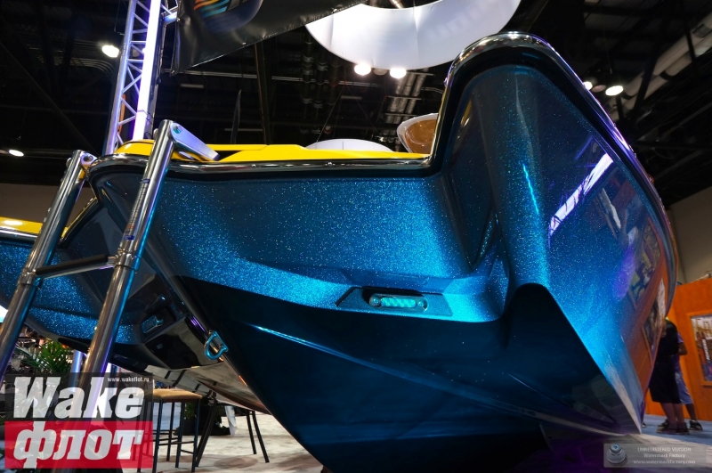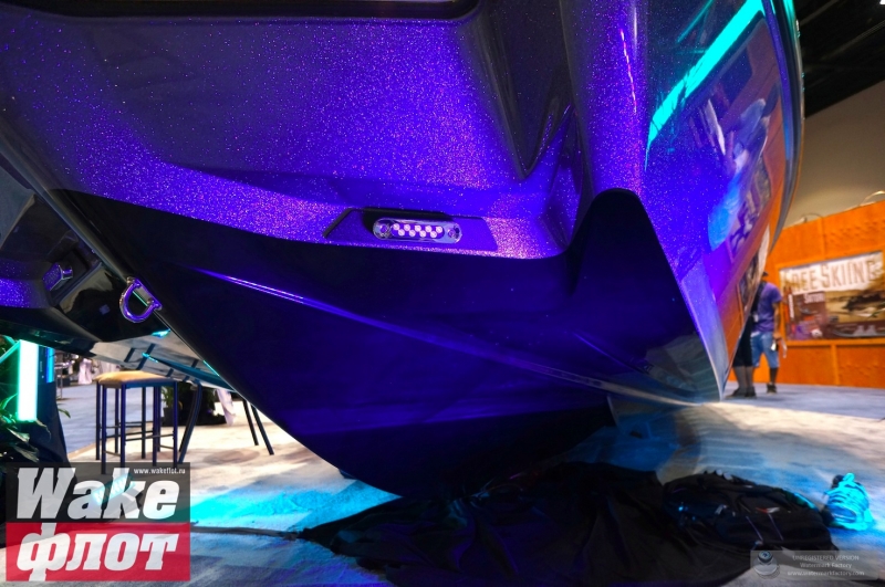 Высота борта катера диктует форму носа, но несмотря на массивный корпус, катер получился изящным, в подводной части лодки прослеживаются мотивы фирменных корпусов Malibu Boats - Diamond Hull.