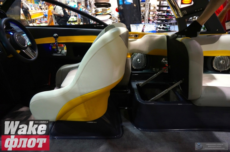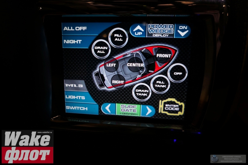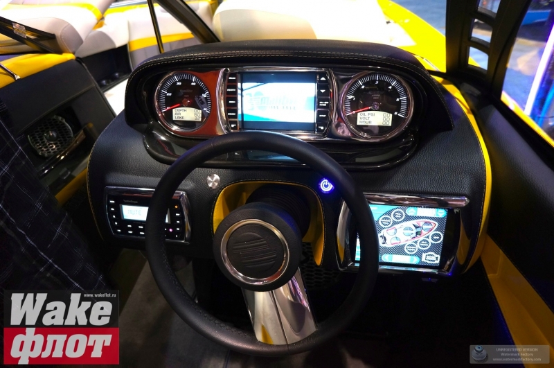 Панель приборов гибридная, аналоговые основные приборы сочетаются с экраном и сенсорной панелью управления. На экран выводятся данные GPS навигатора или видео. Сенсорный экран справа - объединенное управление всеми функциями катера.