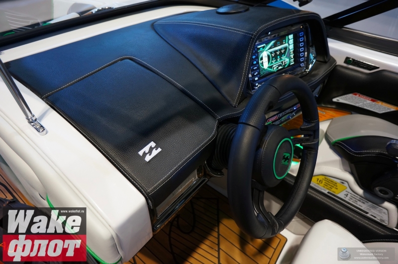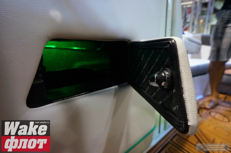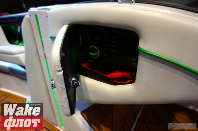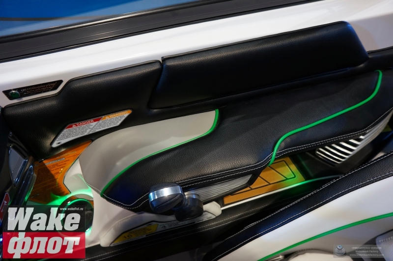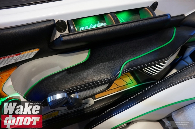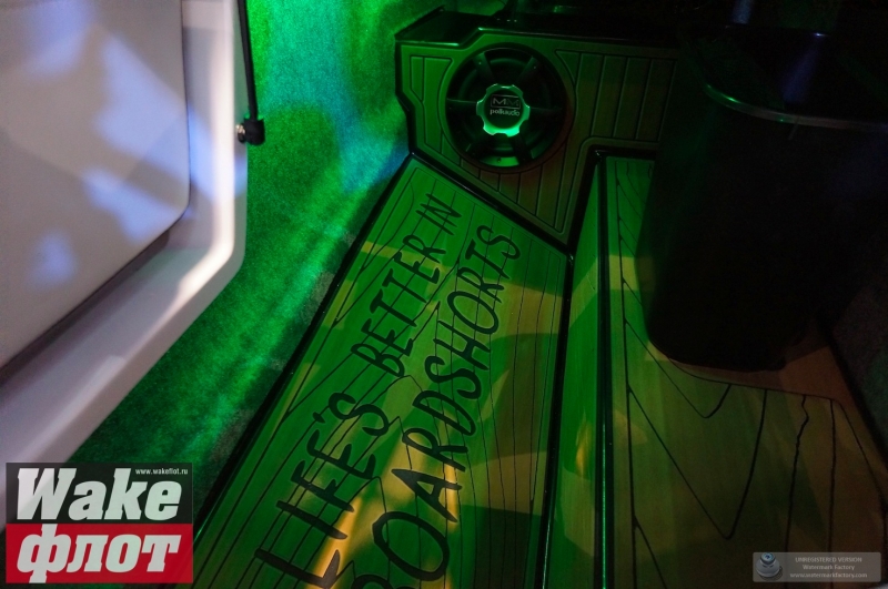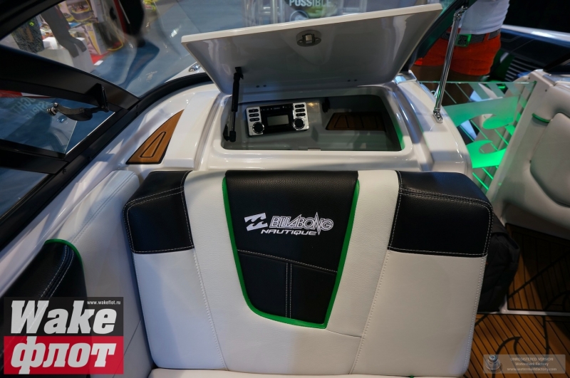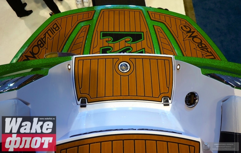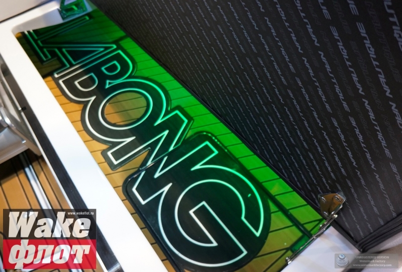 От серийной модели он отличается обилием логотипов Billabong внутри и специальным дизайном корпуса снаружи. Также в салоне много деталей с диодной подсветкой в цвет корпуса катера. Хочется отметить, зеленый металлик отлично смотрится в сочетании с искуственным тиком и металлом.