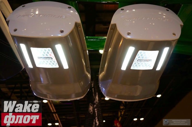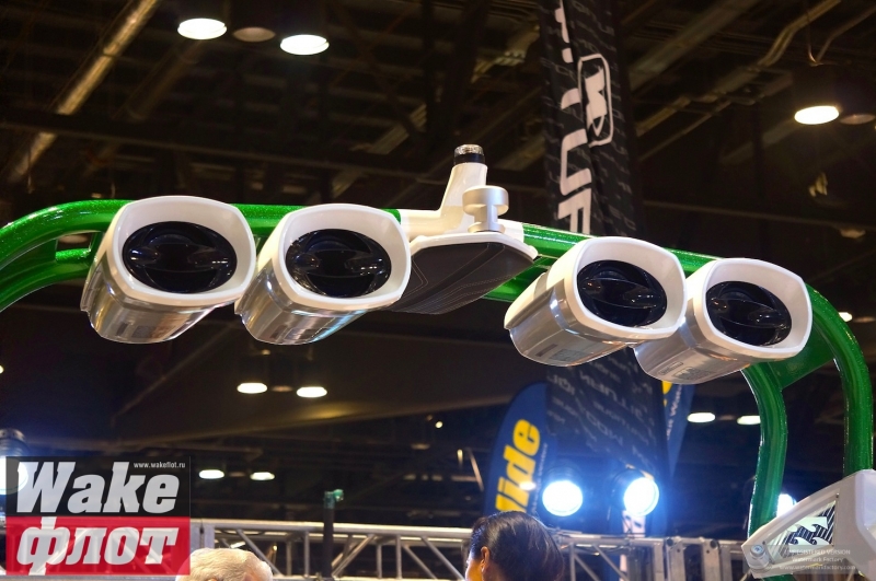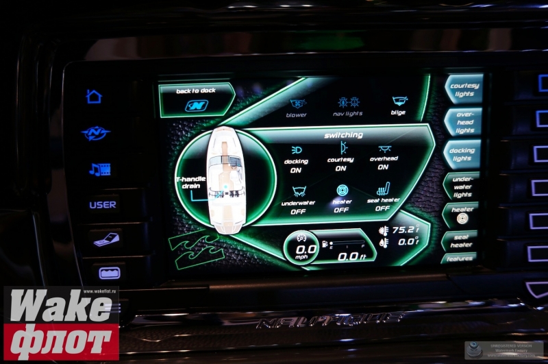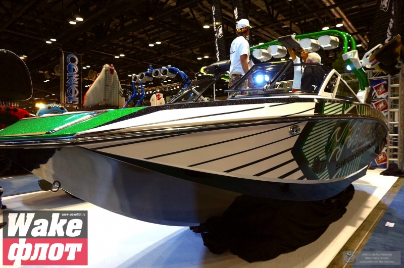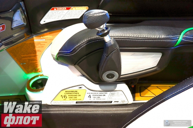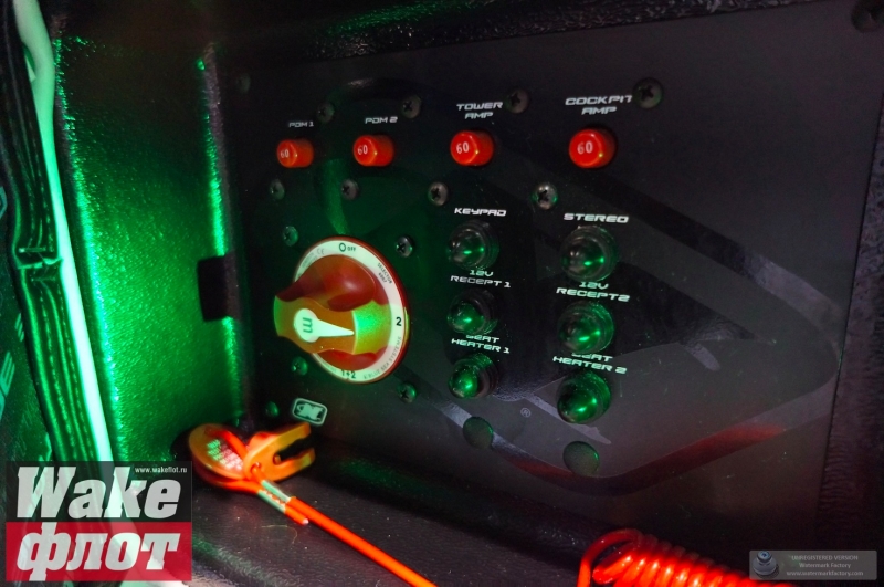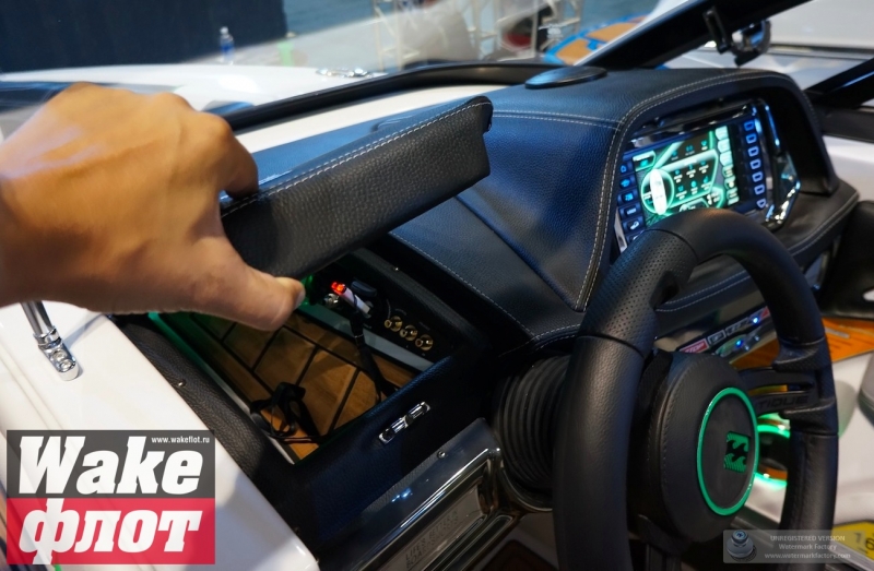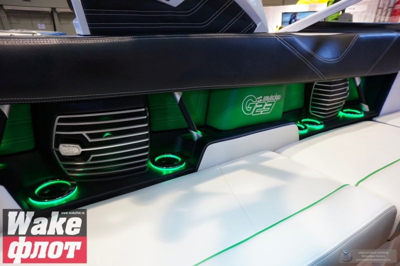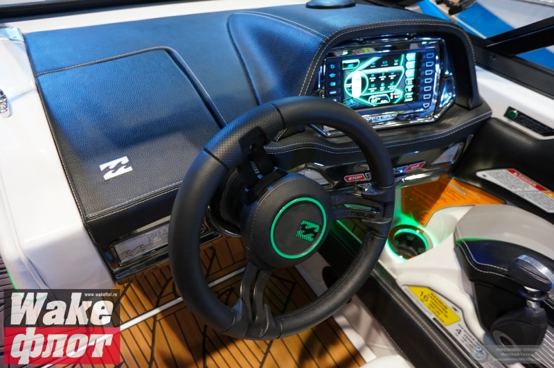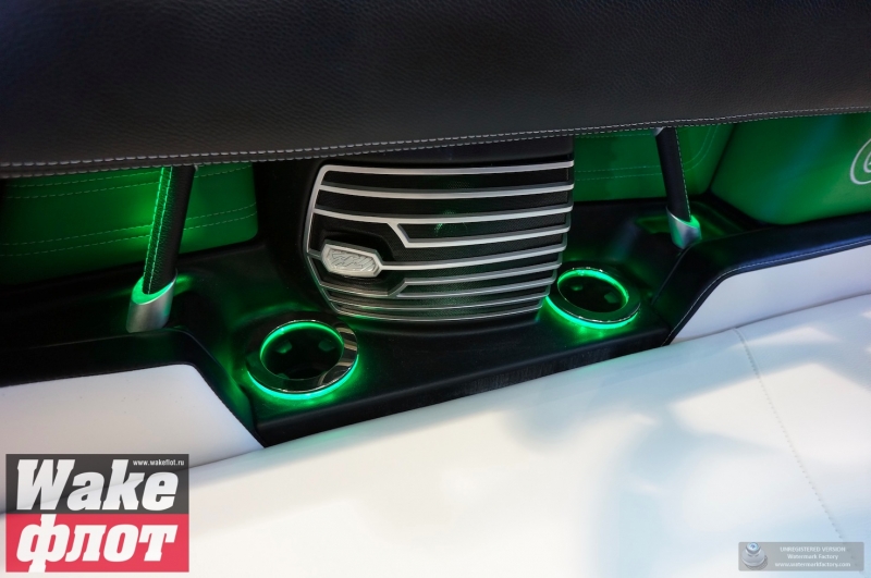 От серийной модели он отличается обилием логотипов Billabong внутри и специальным дизайном корпуса снаружи. Также в салоне много деталей с диодной подсветкой в цвет корпуса катера. Хочется отметить, зеленый металлик отлично смотрится в сочетании с искуственным тиком и металлом.
