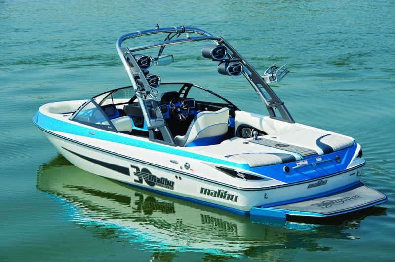 Юбилейная серия окрашена специальной краской - голубой металлик и на многих деталях имеет соответствующий логотип. Эта лодка - одна из самых мультифункциональных моделей Malibu Boats. Обновленный буксировщик имеет абсолютно новую панель приборов и сенсорную панель управления. Лодка делает классические волны с плавным сходом и длинным чистым гребнем.