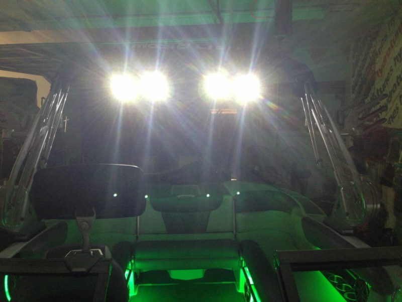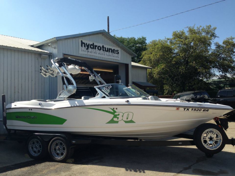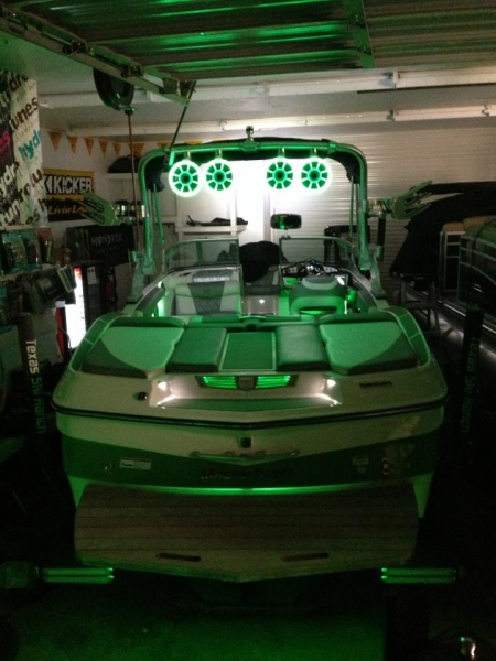 Для примера - отличная инсталляция на тауэр Mastercraft X-30 стерео-системы Wet Sounds. Владельцы этого X-30 очень любят мощный саунд, поэтому на тауэр установлены 4 потрясающие REV-10 со светящимися решетками (требуют установки подсветки колонок).