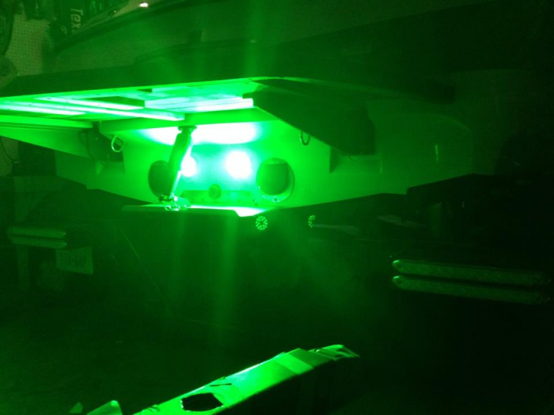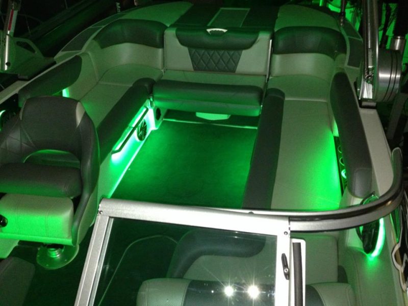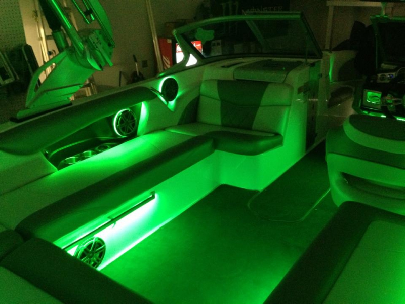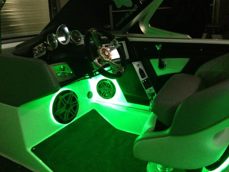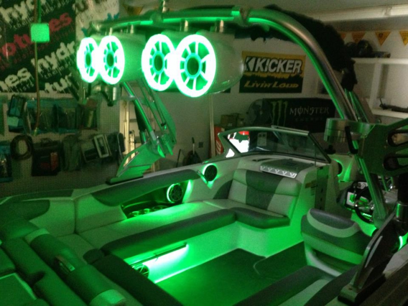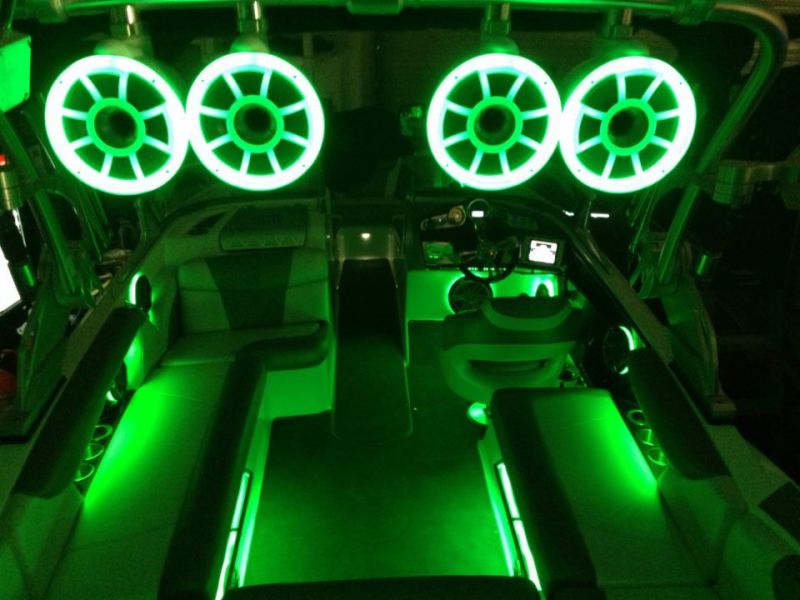 Стандартные сабвуфер и колонки салона подсвечены специальными проставками Wet Sounds: