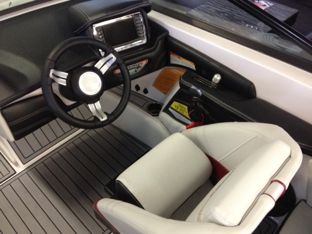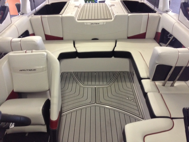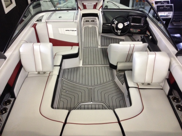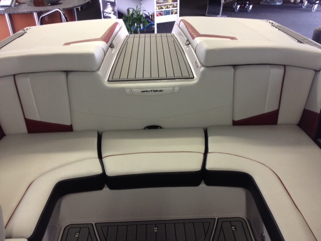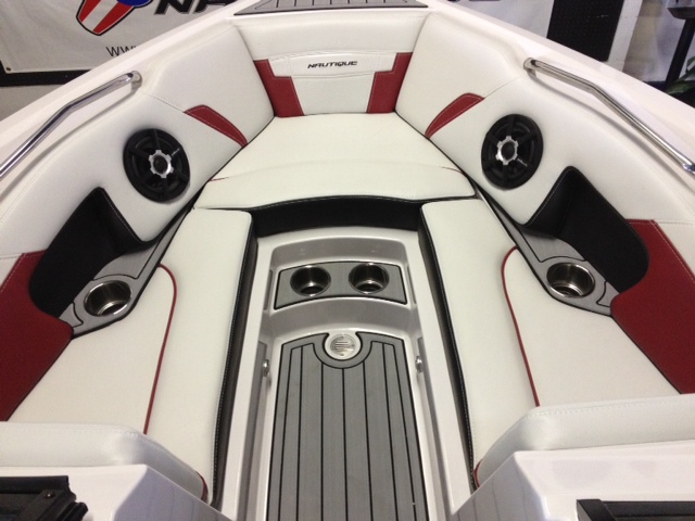 Среднеразмерный классический Nautique 210-й серии полностью обновлен. Инженеры сделали полностью новый корпус, салон же скомпонован как на флагманских G23-G25. Носовой проход широкий, сиденья получились узкие, как на спорткаре, условно +2. Необходимо сразу заказывать центральную подушку в проход. Серый цвет сидений лучше сочетается с серым покрытием палубы, как на промо-лодке.
