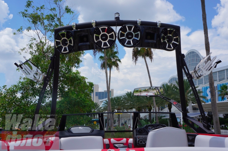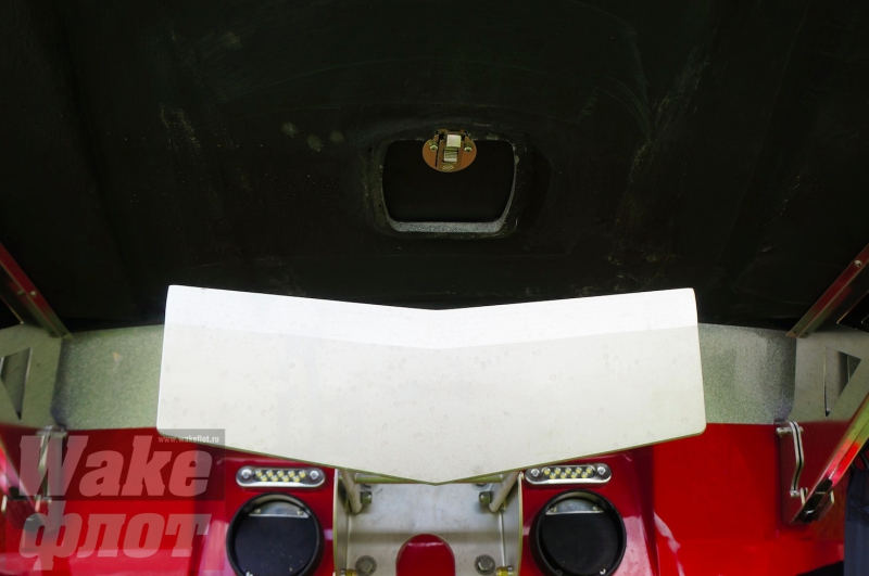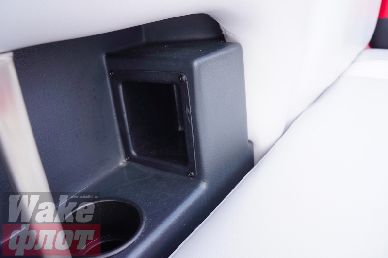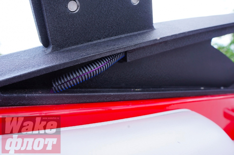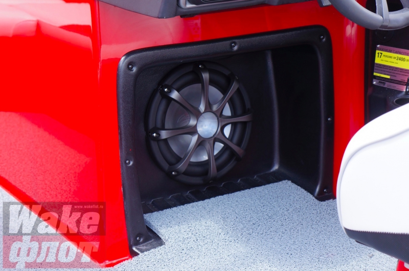 Сабвуфер Wet Sounds закрыт мощной решеткой, но пластиковый кожух ниши черного цвета из тонкого пластика крепится саморезами к корпусу без всяких изысков - выглядит это не очень...