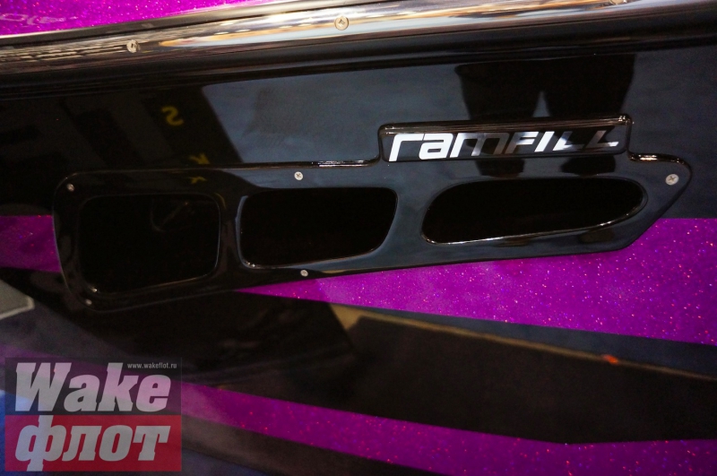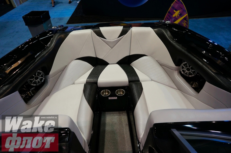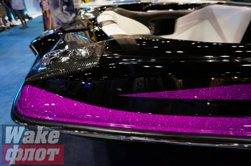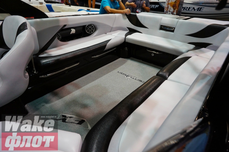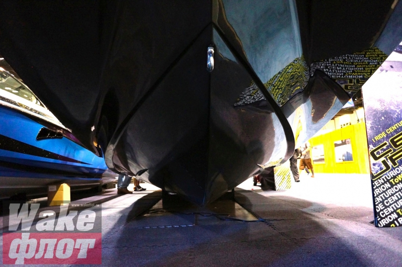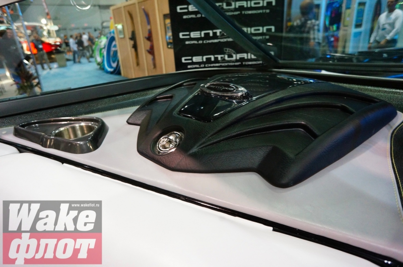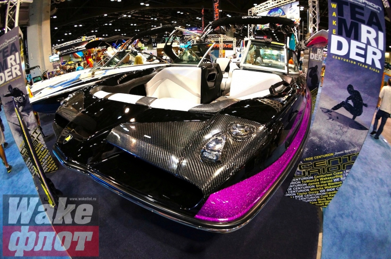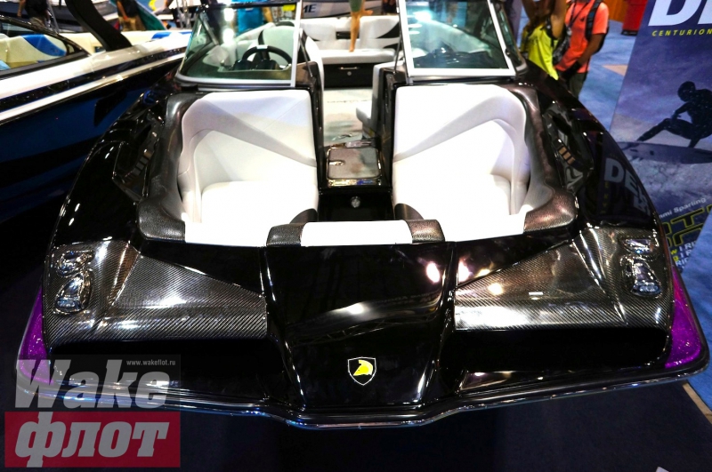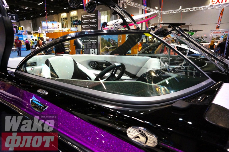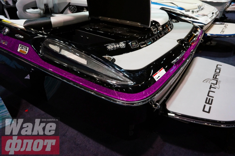 Centurion FX44 - это логичное развитие двухносой серии FX компании Centurion и серьезная заявка на топ лучших буксировщиков планеты. Необычная форма корпуса, где борт имеет мощный редан, формирующий волну и плоский широкий нос, эта лодка необычна не только снаружи. Новая кормовая балластная система RAMFILL заполняется на ходу за 30 секунд, да и новая панель управления необычно выглядит. Кстати, представленная модель черного цвета с вставками фиолетового металлика смотрится весьма эффектно.