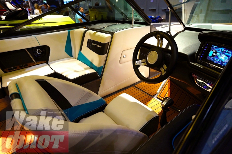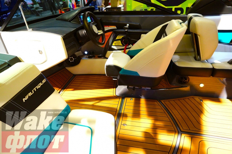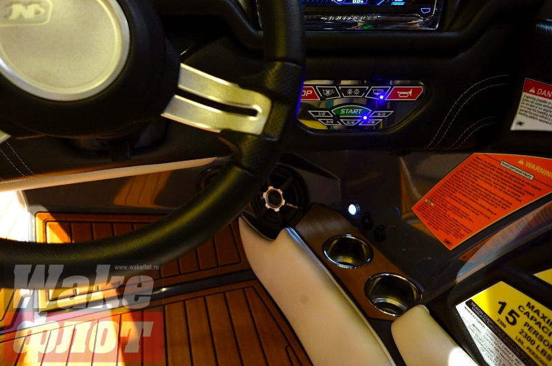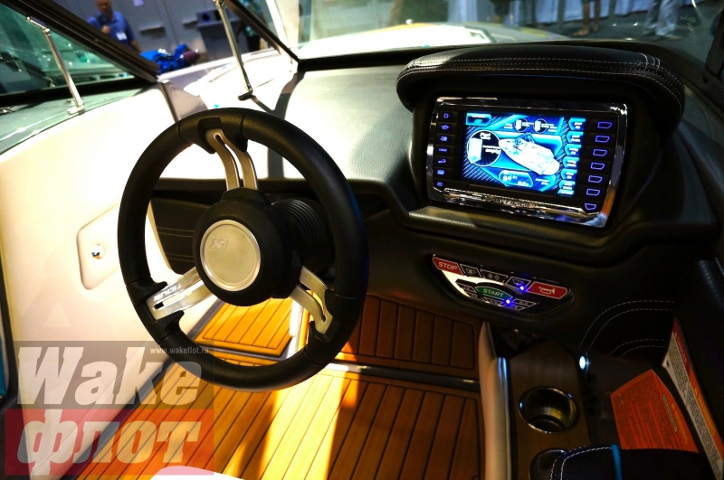 Рабочее место водителя с низкопрофильной панелью приборов и сенсорным дисплеем управления, вынесенным вправо, он позаимствован у Tige Boats, вот только интерфейс у Nautique Boats более запутанный