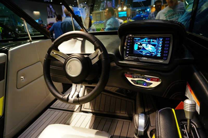 Панель приборов, как у "старшей" серии "G", сенсорная панель справа управляет всеми функциями катера. Это не очень удобно, так как аналоговые приборы отлично работают в паре с сенсорной панелью. Интерфейс неудобный, мелкие кнопки и "многоэтажное" меню не позволяют находить необходимые функции "краем глаза".